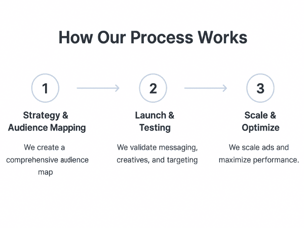 Our proven process ensures every campaign is built, tested, and scaled with precision. This systematic approach is a key part of our high-performing facebook marketing services.